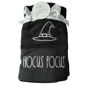 Elevate your Halloween home decor with this set of spooky hand towels featuring the whimsical charm of Rae Dunn. With the phrase “Hocus Pocus” and an adorable which hat adorning each towel, these hand towels capture the spirit of the spooky season while adding a touch of fun and personality to your kitchen or bathroom. What makes these hand towels truly special is their versatility. While perfect for Halloween, they can be used year-round to celebrate the spooky season in your home. Whether you’re a Halloween enthusiast or simply enjoy a touch of witchiness into your decor, these towels are a fantastic addition to your collection. The Rae Dunn touch is evident in the attention-grabbing typography, where the phrase “Hocus Pocus” is artistically displayed. The white lettering against the crisp black background adds a striking contrast, instantly drawing the eye and capturing the playful nature of the Halloween season. Dimensions: 16″ X 30″ each
