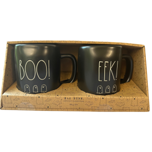 The mugs themselves are crafted from high-quality ceramic and finished with a sleek black glaze, which serves as the perfect backdrop for the bold white letters spelling out “Boo!” and “Eek!” in Rae Dunn’s signature font. Each mug also features a small and cute ghost graphic, adding a playful touch to the overall design.