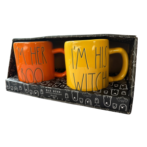The mugs themselves are crafted from high-quality ceramic in orange and yellow, which serves as the perfect backdrop for the fun sayings “I’m Her Boo” and “I’m His Witch” in Rae Dunn’s signature font.
