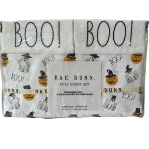 The set includes a fitted sheet, a flat sheet, and two pillowcases, all adorned with Halloween-themed words and phrases with the word “BOO!” in Rae Dunn’s unique font, all in black letters on a crisp white background. The playful and fun design is sure to add a touch of Halloween spirit to your bedding, while still maintaining a stylish and modern look.