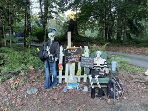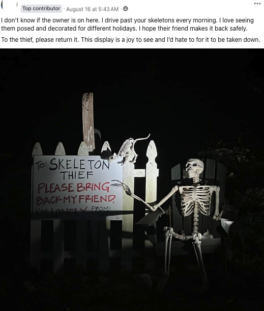 This just seemed like a slam dunk to me, so I put one of my skeletons (I sell them right here if you need one) in my car and took it right over to their house. They were not home, so I ended up just leaving the skeleton on their porch. I don’t know why, but I thought it would be funnier if this act of kindness was anonymous, so I left a note to the effect of “Someone on Facebook said your skeleton was stolen, so here is a replacement. Thank you for your creative displays, which brighten so many people’s days.”